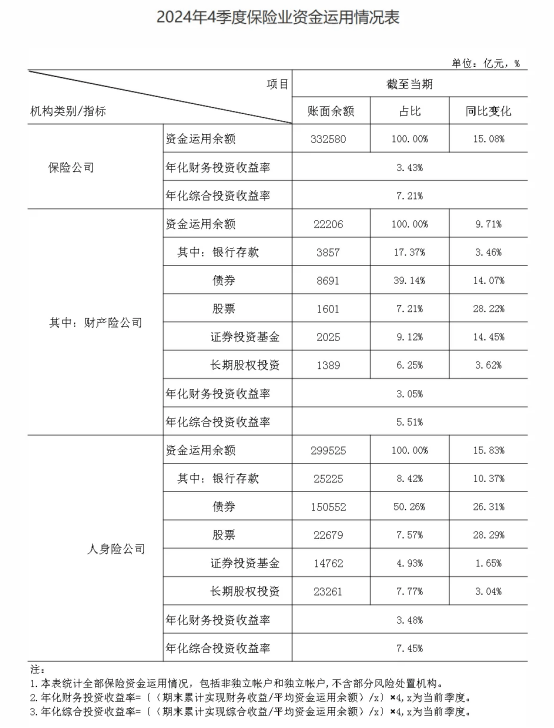 从 2024 年 4 季度保险业资金运用情况表来看,人身险公司股票投资 2.3 万亿,占资金运用余额比 7.57%;基金 1.47 万亿,长期股权投资 2.3 万亿。