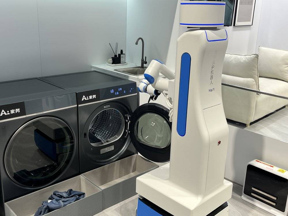 另一边海尔则展示了机械臂在洗衣场景下的应用,通过与洗衣机的联动,实现衣物的自动取放和收纳。
