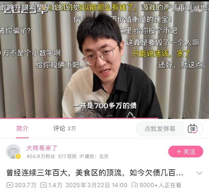 日前,曾经的 B 站美食区头部 UP 主 「大祥哥来了」 发布自述视频,分享自己从年入百万,到因轻信 「商业大佬」 而负债数百万的惨痛经历。当天,相关话题登上微博热搜,引发广泛关注。