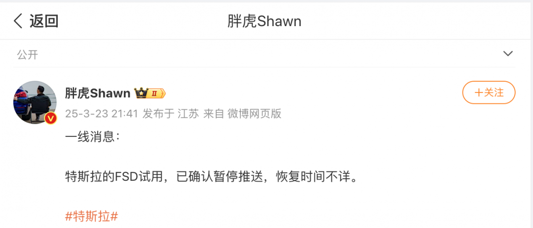 3 月 24 日消息,据微博博主 「胖虎 Shawn」 爆料,「特斯拉的 FSD 试用,已确认暂停推送,恢复时间不详。」