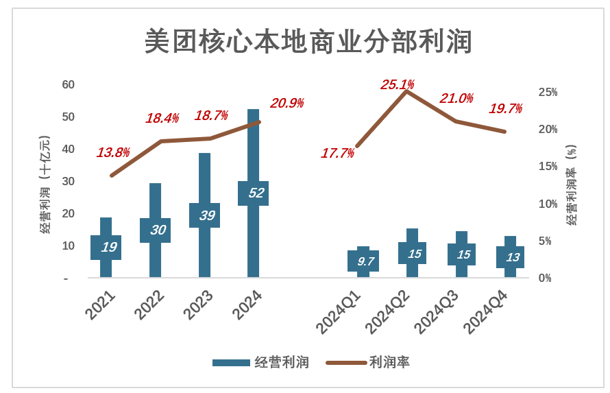 2024 年,核心本地商业分部经营利润进一步攀升至 524 亿、利润率 20.9%。