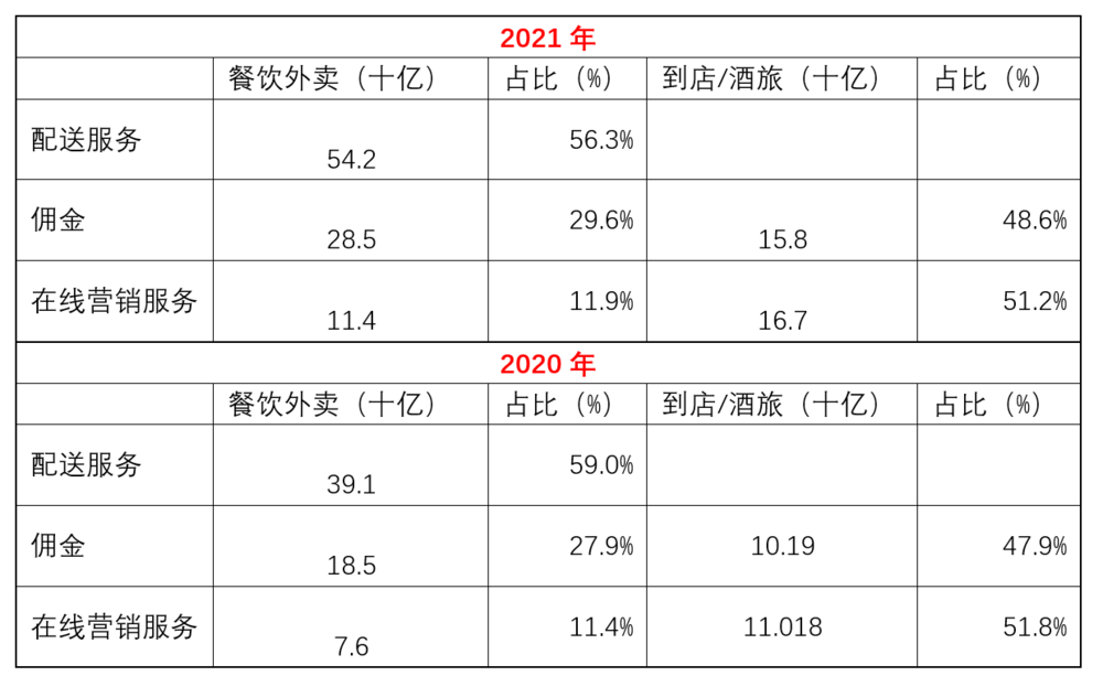 2021 年,佣金增至 529 亿;其中仍有 54% 来自配送服务、30% 来自到店/酒旅、其余来自新业务;