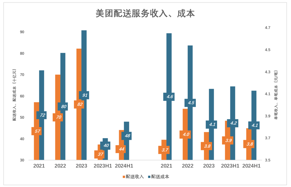 2024 年 H1,配送 116 亿笔,单笔收入、成本分别为 3.86 元、4.13 元,每笔亏损 0.34 元,亏损率 9%;