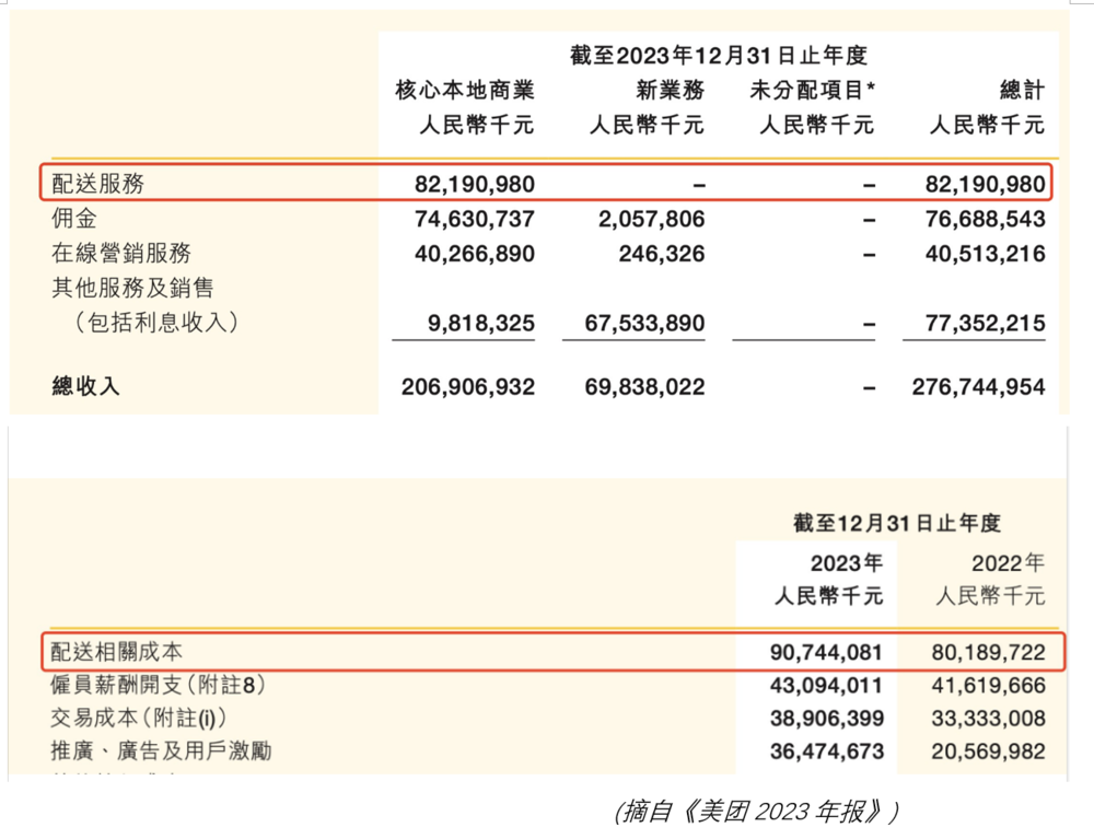 以 2023 年为例:2023 年 「配送服务」 收入 821.9 亿,「配送相关成本」907.4 亿,毛亏损 85.5 亿 (注:下图截屏自 《美团 2023 年报》,P274、P277)。