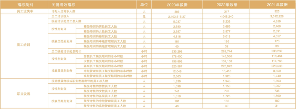 再翻看其社会绩效中的各项员工指标,2023 年离职人数 386 人,2021、2022 年分别为 325、317,逆转趋势、不降反增;雇佣人数却在减少,2021、2022、2023 年分别为 4859、5236、5037;员工培训投入方面,2023 年投入金额 2103515 元,2021、2022 年分别为 3012228 元、4048240 元,同比上一年几乎腰斩。