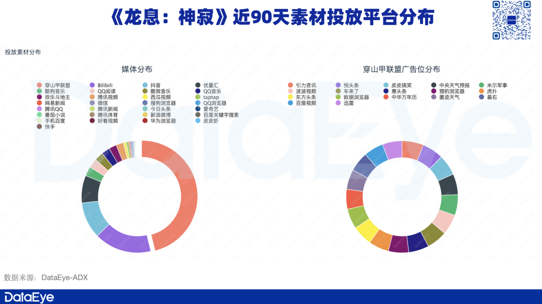 DataEye-ADX 数据显示,近 90 天,穿山甲联盟是 《龙息:神寂》 素材投放占比最高的平台,在此之外,《龙息:神寂》 会投放 B 站、抖音、优量汇等渠道。