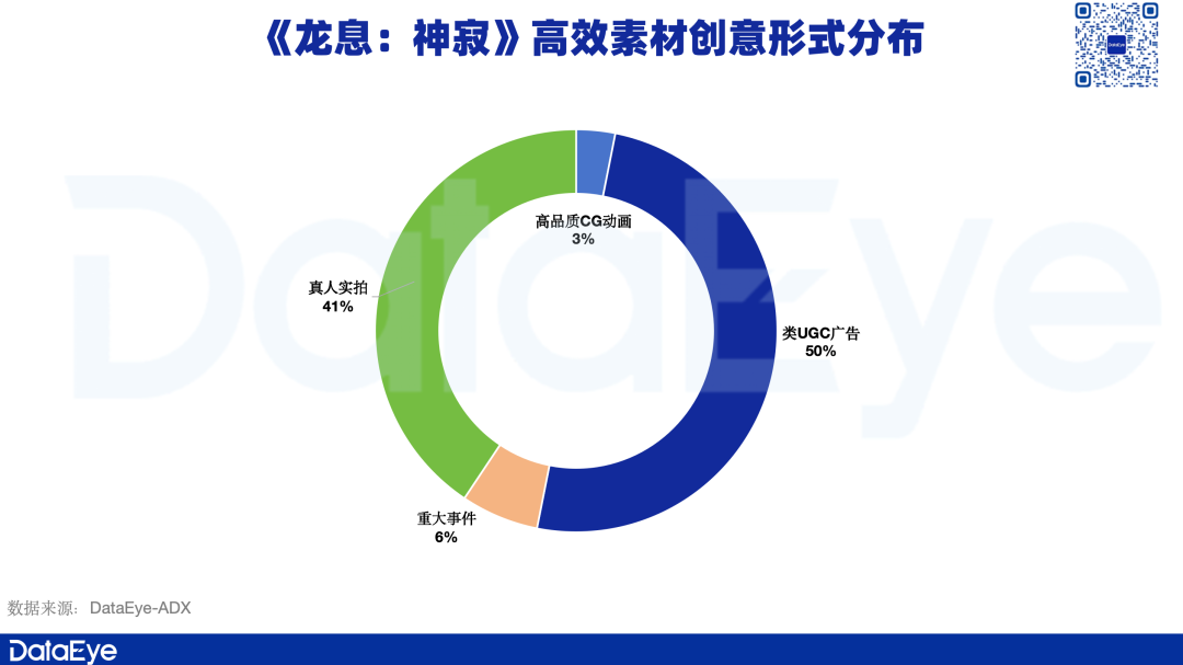 DataEye-ADX 数据显示,今年以来,《龙息:神寂》 最多计划使用的 TOP30 支视频素材内容中,主要是类 UGC 广告素材占比约为 50%,真人实拍素材占比约为 41%。