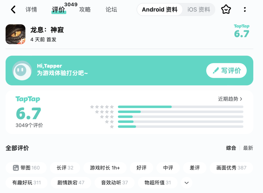 玩家反馈方面,截止至 3 月 24 日,《龙息:神寂》 在 TapTap 平台为 6.7 分,玩家总评论数为 3049 条。其中,好评评论主要集中在“ 音效动听”、“ 画面优秀” 等方面,差评则是体现在“ 肝度” 以及“ 资源获取” 等方面。