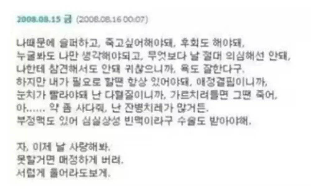 「你要为我悲伤,为我死,为我后悔,为我着想,绝对不能怀疑我,不能干涉我,我会骂人。我需要的时候你要一直在,因为我缺爱。要有眼色,因为我很冲动。要帮我买药,我小病很多,心率不齐,还得做手术。」