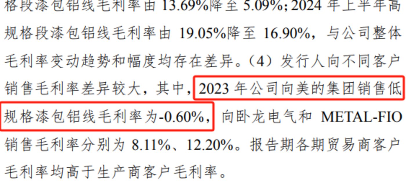 而北交所的问询函显示,2023 年,兢强科技向美的集团销售低规格漆包铝线的毛利率为-0.6%。这不禁令人困惑,作为兢强科技第一大产品的低规格漆包铝线,公司为何亏本将该产品销售给第一大客户美的集团?