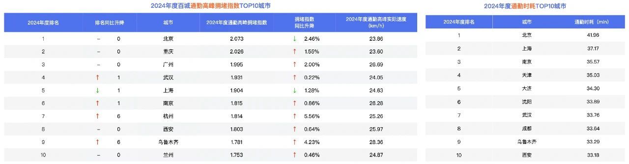 具体来看,2024 年,全国交通运行状况平稳发展,全国多城市通过智能调度与交通治理,显著提升通勤效率。报告数据显示,北京、上海等超大城市公共交通网络优化和智慧交通管理初见成效,虽然通勤时耗位居全国前列,但通勤高峰拥堵指数分别同比下降 2.46% 与 1.28%。