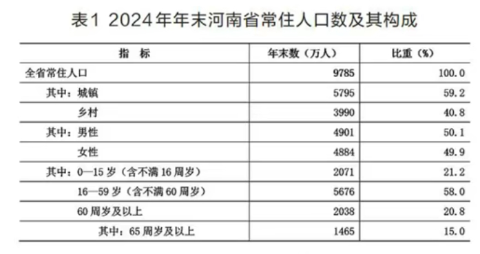 4 月 3 日,河南省统计局公布 《2024 年河南省国民经济和社会发展统计公报》。其中显示,2024 年末全省常住人口 9785 万人,其中城镇常住人口 5795 万人,乡村常住人口 3990 万人;常住人口城镇化率为 59.22%,比上年末提高 1.14 个百分点。