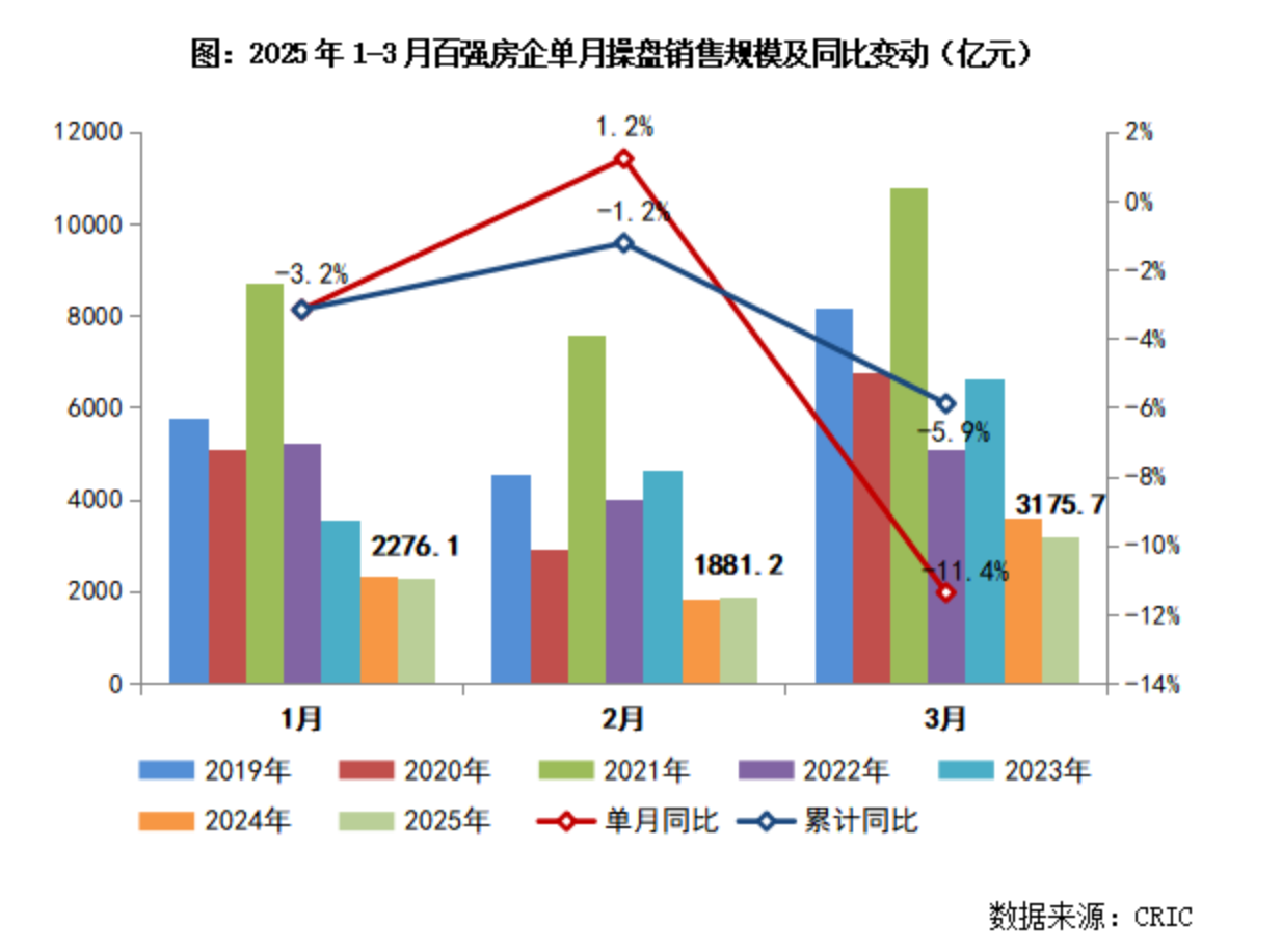 不过据克而瑞数据,3 月百强房企实现操盘销售金额 3175.7 亿元,环比增长 68.8%,同比下降 11.4%。累计来看,百强房企今年一季度实现操盘销售金额 7333 亿元,同比降低 5.9%。「2025 年一季度,房地产市场整体保持低位运行,延续止跌回稳态势。」