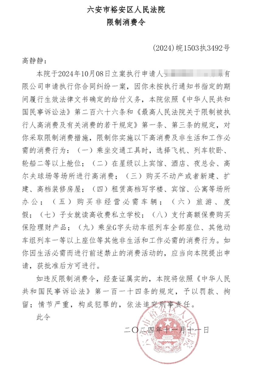 记者联系到视频拍摄者,其表示:视频系当天中午拍摄,自己所在的公司与视频中女子高某某存在经济纠纷,欠款近一年。拍摄者提供了安徽省六安市裕安区人民法院对高某某开出的限制消费令,记者查询中国执行信息公开网,找到该该消费令,立案时间为 2024 年 10 月 8 日。