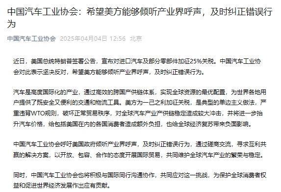 中国汽车工业协会呼吁美国政府倾听产业界呼声,及时纠正错误行为,通过磋商交流,寻求互利共赢的解决方案,以开放、包容、合作的态度开展国际贸易,共同维护全球汽车产业的繁荣与稳定。