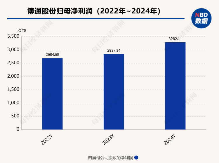 2022 年至 2024 年,博通股份营业收入分别为 2.37 亿元、2.63 亿元、2.87 亿元,对应的净利润分别为 2685 万元、2837 万元、3282 万元。