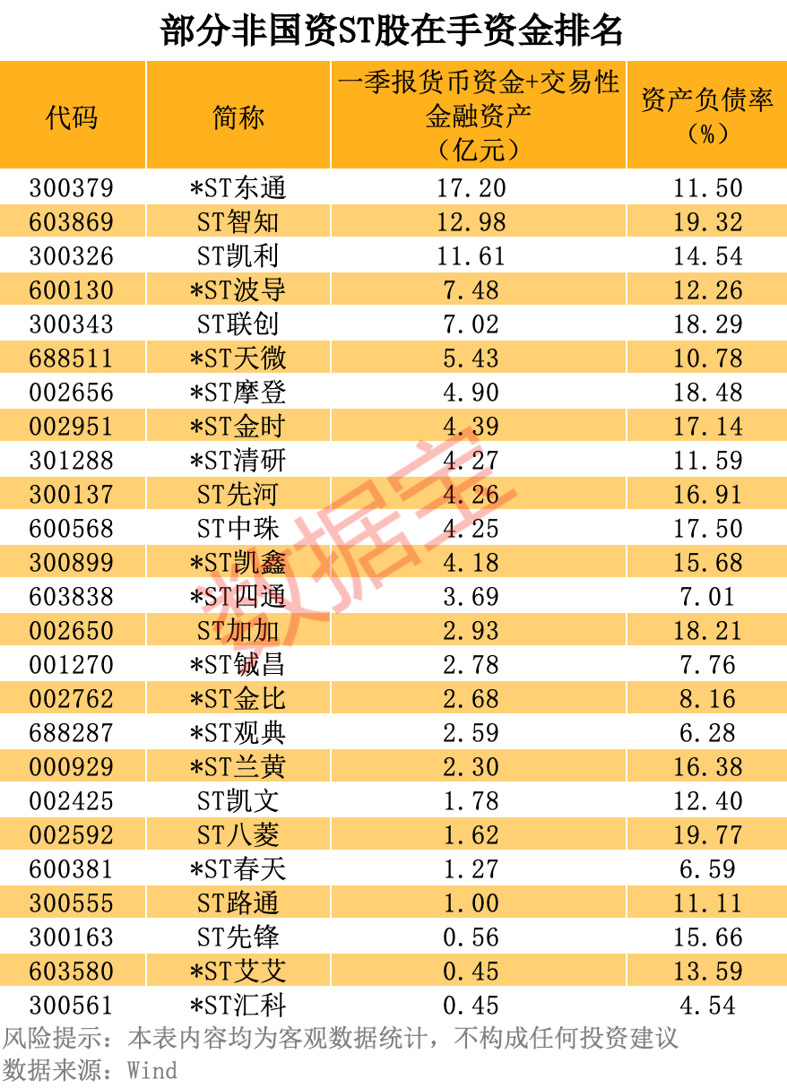 数据显示,一季度末资产负债率在 20% 以下的非央国企 ST 股票中,*ST 东通、ST 智知、ST 凯利等个股一季度末在手货币资金及交易性金融资产合计均超 10 亿元。