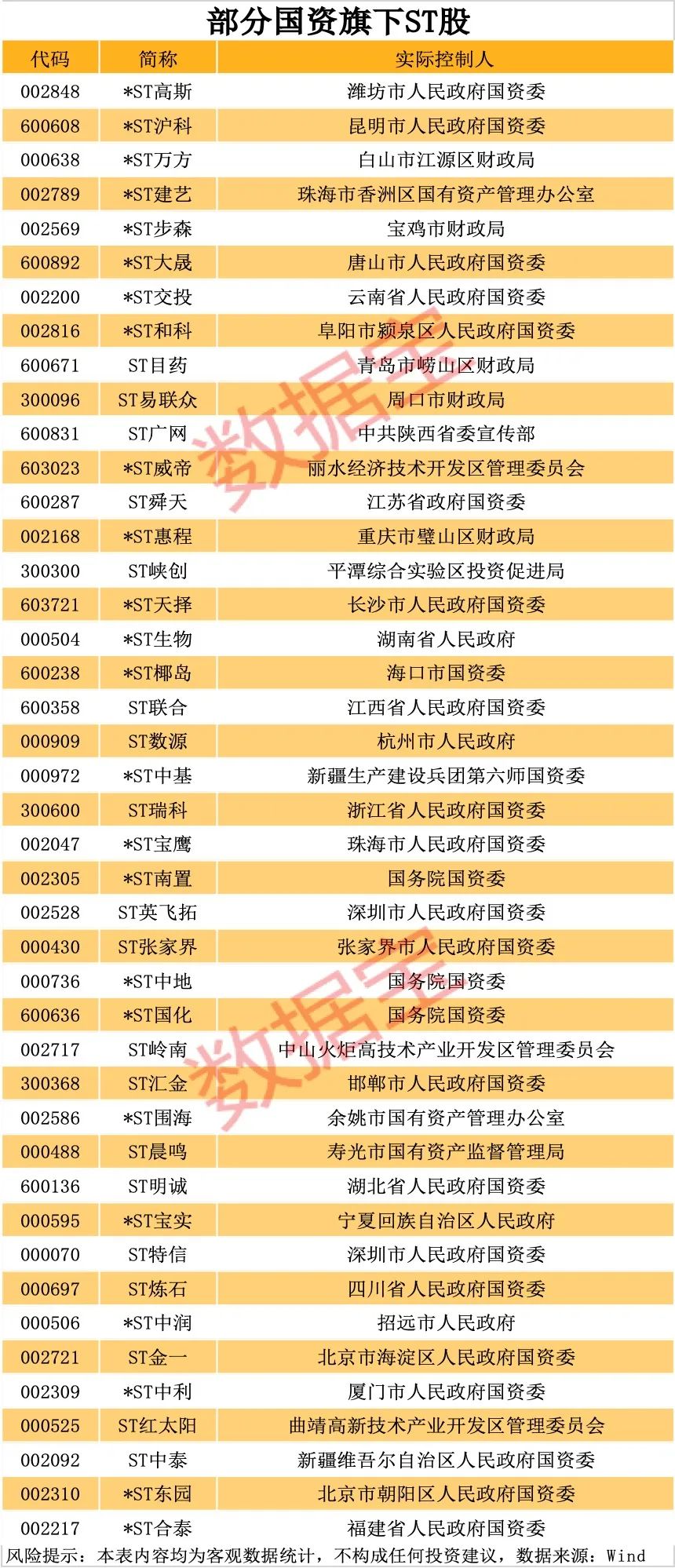 据数据宝统计,有 47 只 ST 股票为央国企股,其中,*ST 国化、*ST 南置、*ST 中地等个股为央企,控股股东分别为中国文化产业发展集团有限公司、中国电建地产集团有限公司、中交房地产集团有限公司。