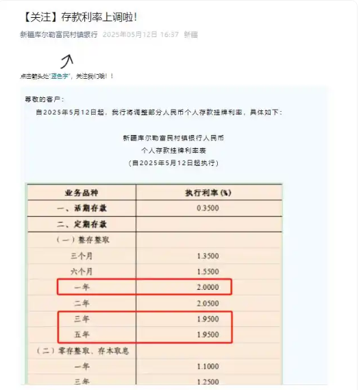 5 月 12 日, 新疆库尔勒富民村镇银行在官方微信公众号发文称,自当日起调整部分人民币个人存款挂牌利率。该行最新信息显示,其 1 年期存款利率 (2%) 已经高于 5 年期利率 (1.95%)。