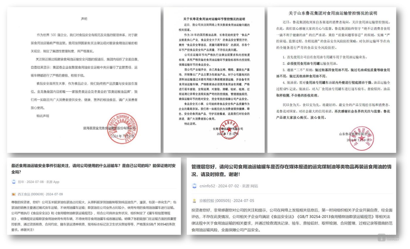 一些食用油公司怕牵涉其中,也纷纷进行了回应。鲁花集团发布声明回应称,首先使用公司自有食用油专用罐车用于食用油运输业务,必须使用食用油专用罐运输食用油,遵循 「三不」 原则。