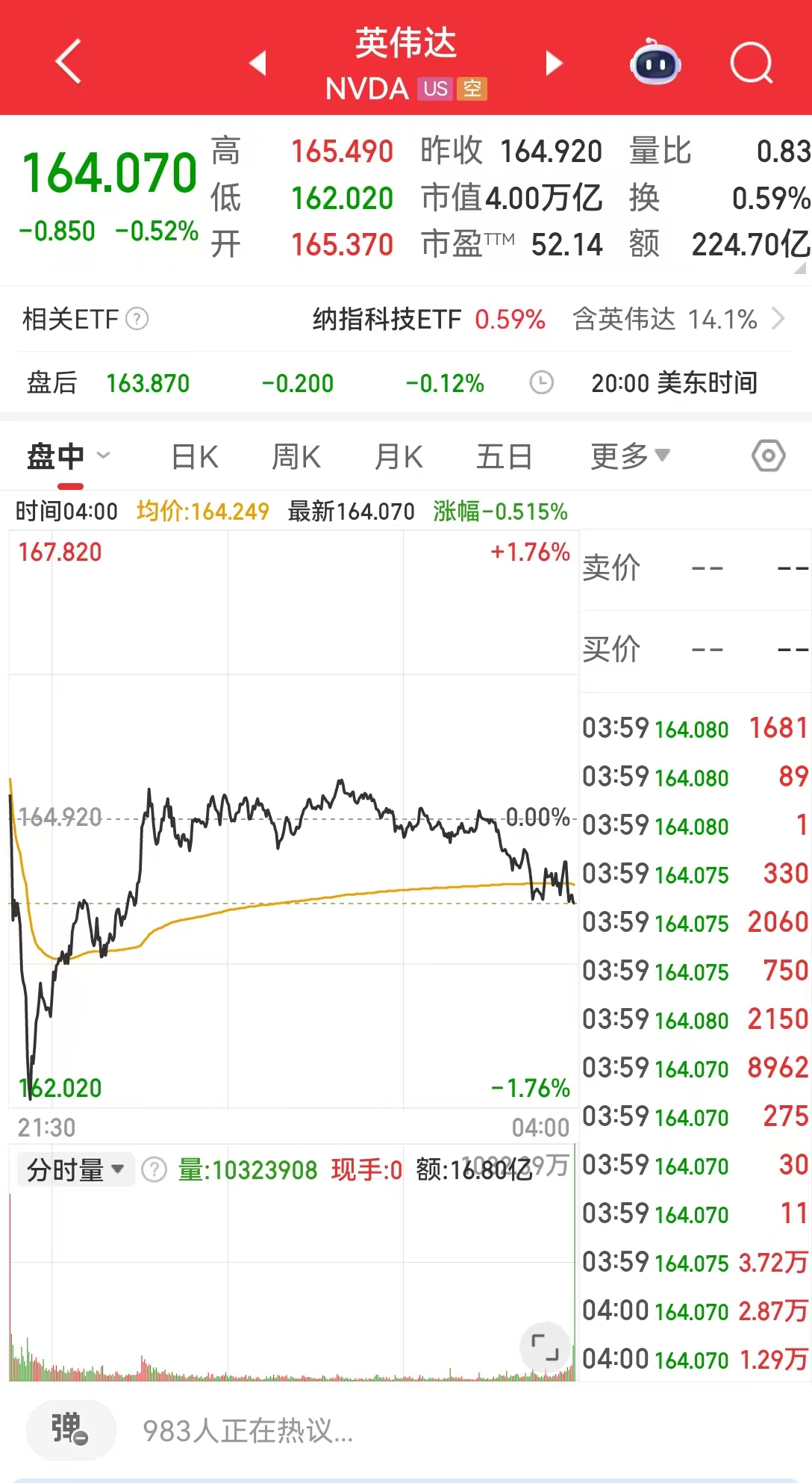 截至当地时间 7 月 14 日美股收盘,英伟达报 164.07 美元,跌幅 0.52%。
