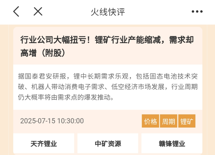 消息面上,在 「反内卷」 的影响下,一些板块走强,如光伏、锂矿。在每日经济新闻 App 私人订制的 「火线快评」 中,7 月 15 日就提到锂矿板块,相关个股持续上涨。