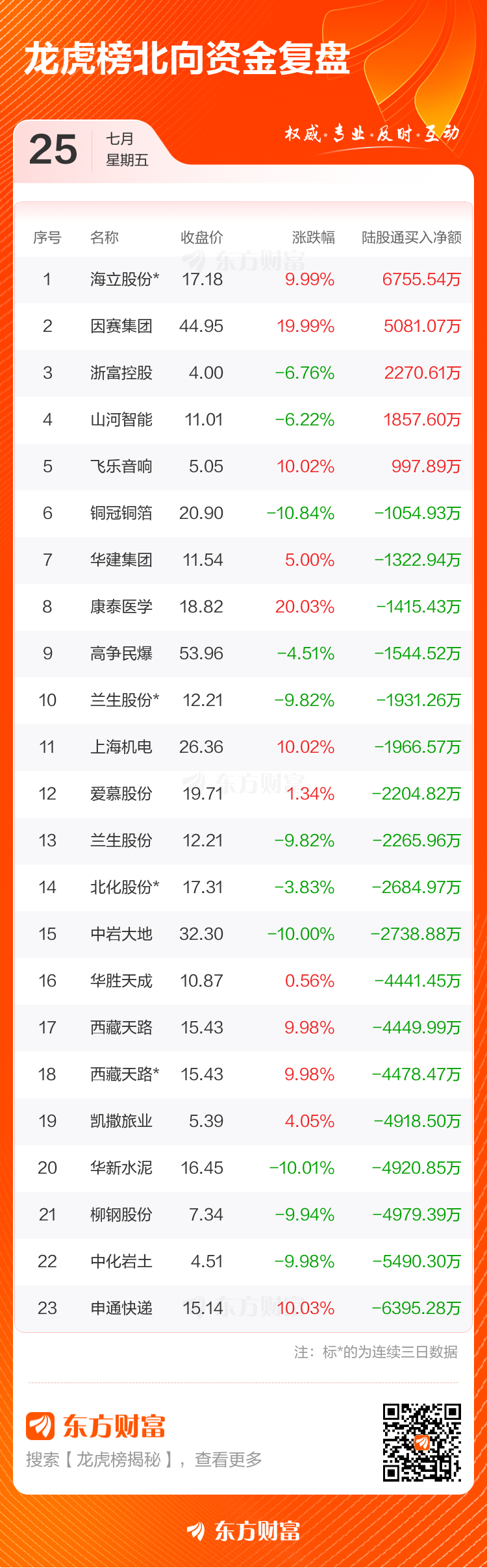 7月25日共有60只个股(含1只可转债)上榜龙虎榜,总上榜成交额169.21亿元。上榜个股中净买入额最高的是西藏天路,金额为5.46亿元。 当天,游资席位净买入金额最高的个股是因赛集团,“中山东路”净买入6414.94万元。 免责声明:本文基于AI生产,仅供参考,不构成任何投资建议,据此操作风险自担。(东方财富研究中心) 文章转载自东方财富