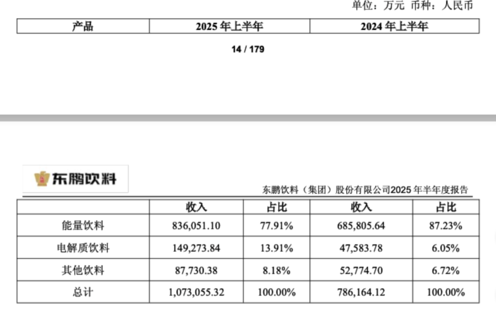 东鹏饮料的电解质饮料指的是 「东鹏补水啦」,主要针对运动和学生等人群,在持续推出多种口味、多规格包装后,东鹏饮料也推出了 「无糖」 系列补水啦电解质饮料。上半年,电解质饮料收入占比由上年 6.05% 提升至本年 13.91%,收入约 14.93 亿元,基本追平 2024 年全年销售总额 (14.95 亿元)。