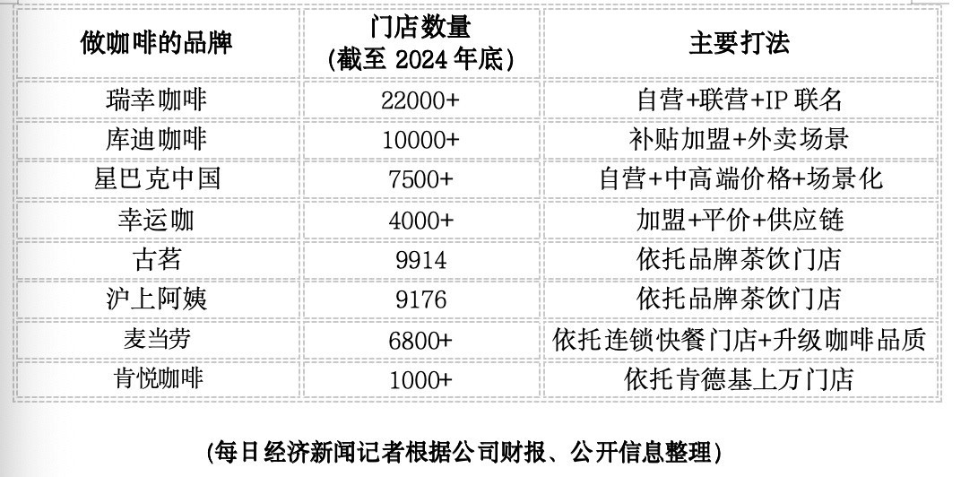 一个现实的情况是,幸运咖在 2025 年喊出万店目标时,咖啡市场已进入混战时刻:瑞幸咖啡、库迪咖啡在高线市场攻城略地,库迪咖啡甚至宣称要在 2025 年底时将门店开到 5 万家;门店数都在 9000 家以上的 「古茗」「沪上阿姨」 也跨界布局咖啡产品;在中国市场拥有上万家门店的肯德基,推出独立咖啡品牌 「肯悦咖啡」;2025 年初,有着约 7000 家门店的麦当劳升级 「麦咖啡」。而且,这些品牌的咖啡都主打十元以下价位。