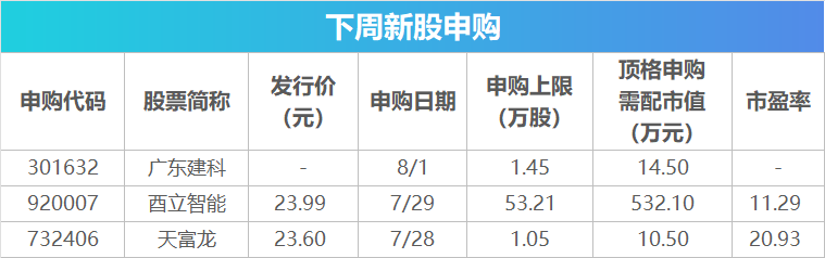 沪市主板新股天富龙将于 7 月 28 日开始网上申购,申购代码为 732406。北交所新股酉立智能将于 7 月 29 日开始网上申购,申购代码为 920007。创业板新股广东建科将于 8 月 1 日开始网上申购,申购代码为 301632。