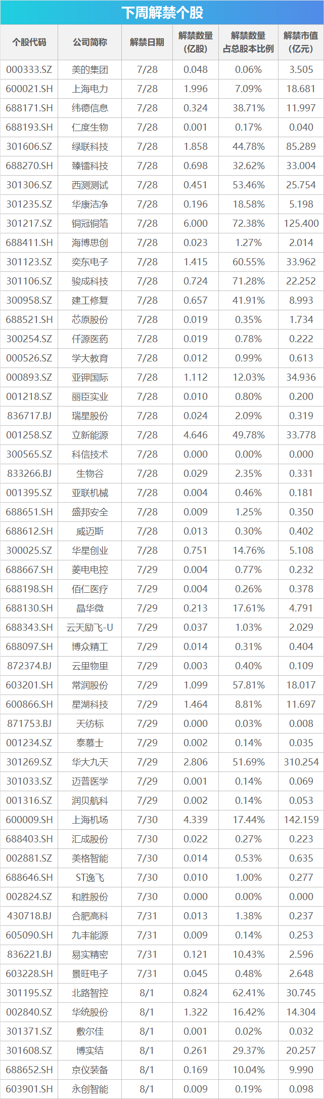 从解禁市值来看,7 月 28 日是解禁高峰期,26 家公司解禁市值合计 454.26 亿元,占下周解禁规模的 44.24%。按最新收盘价计算,解禁市值居前三位的是:华大九天(310.25 亿元)、上海机场(142.16 亿元)、铜冠铜箔(125.4 亿元)。从个股的解禁量看,解禁股数居前三位的是:铜冠铜箔(6 亿股)、立新能源(4.65 亿股)、上海机场(4.34 亿股)。