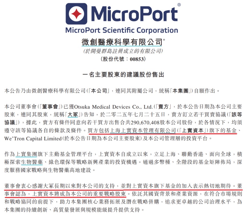 微创医疗(00853.HK)7 月 25 日公告,董事会已获 Otsuka Medical Devices Co., Ltd.(卖方,为公司主要股东,连同其股东,统称 「大冢」) 告知,2025 年 7 月 25 日,卖方订立若干买卖协议,据此,卖方有条件同意向若干买方出售总计约 2.91 亿股公司股份。