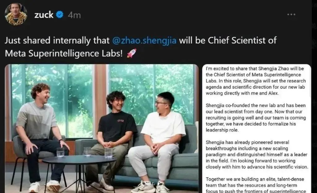扎克伯格在 Threads 上发帖宣布此消息时写道:「赵昇佳是我们新实验室的联合创始人,也是自项目启动以来的首席科学家。如今团队招募进展顺利、人员基本就位,我们决定正式确认他的领导角色。」