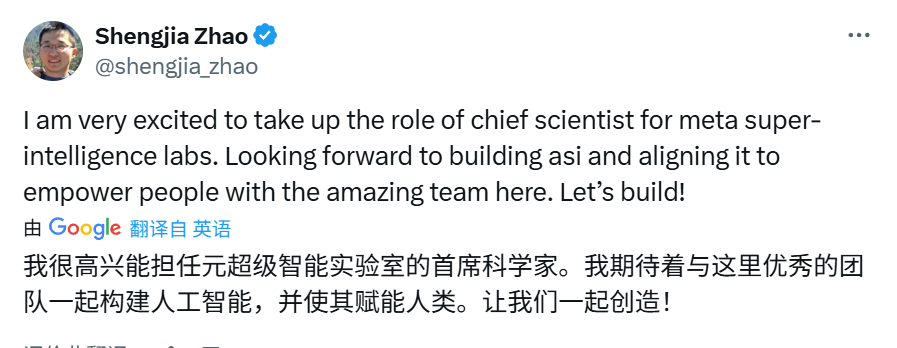 赵昇佳在社交平台发文回应称:「我非常激动能够担任 Meta 超级智能实验室的首席科学家。期待与这里这支出色的团队一起构建通用超级智能 (ASI),并使其发展方向与赋能人类的目标保持一致。让我们一起开干吧!」