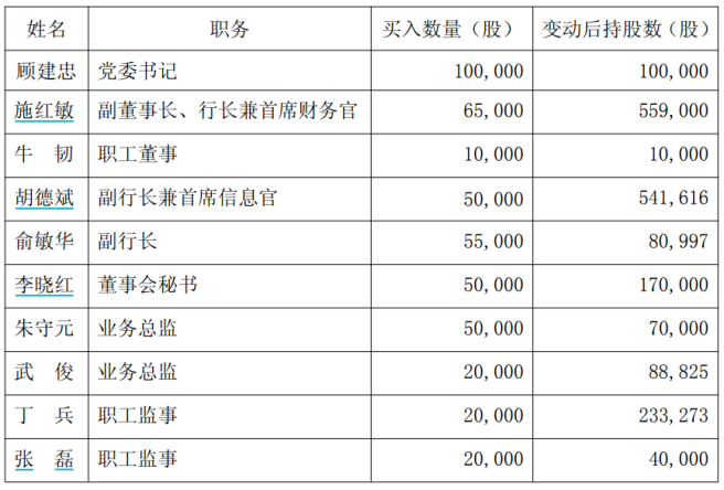具体看,在此次上海银行的增持行动中,该行党委书记顾建忠买入 10 万股,斥资金额达百万元。紧随其后,该行行长兼首席财务官施红敏、副行长俞敏华、副行长兼首席信息官胡德斌增持股票数量分别为 6.5 万股、5.5 万股、5 万股。