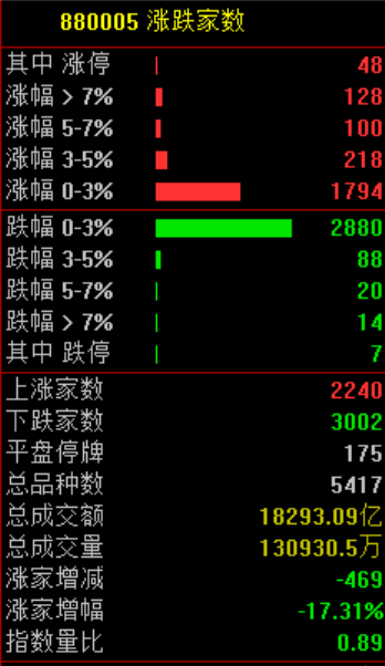 市场共 2240 只个股上涨,48 只个股涨停,3002 只个股下跌。