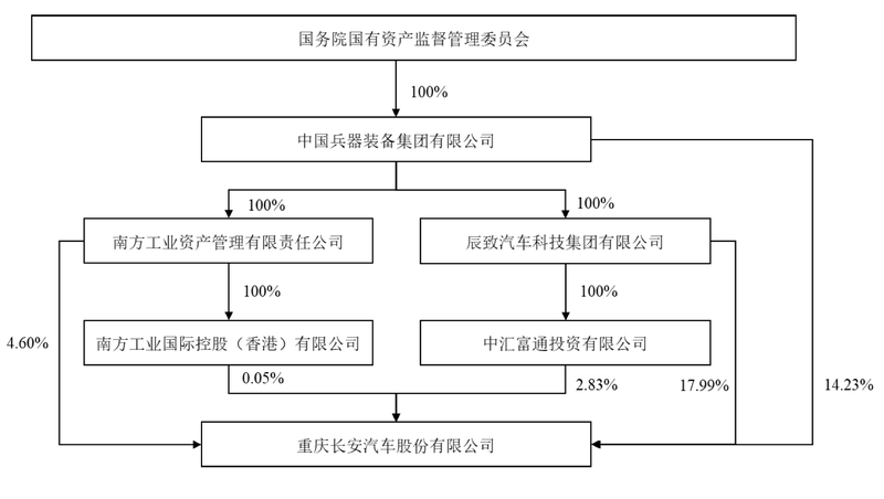 此前,兵器装备集团直接持有长安汽车 14.23% 的股份,并通过辰致集团、中汇富通投资有限公司 (简称 「中汇富通」)、南方工业资产管理有限责任公司、南方工业国际控股 (香港) 有限公司间接持有长安汽车 25.46% 的股份,合计持有长安汽车 39.69% 的股份。本次权益变动后,中国长安汽车直接持有长安汽车 14.23% 的股份,并通过辰致集团、中汇富通的间接持股,合计持有长安汽车 35.04% 的股份,成为长安汽车的间接控股股东。