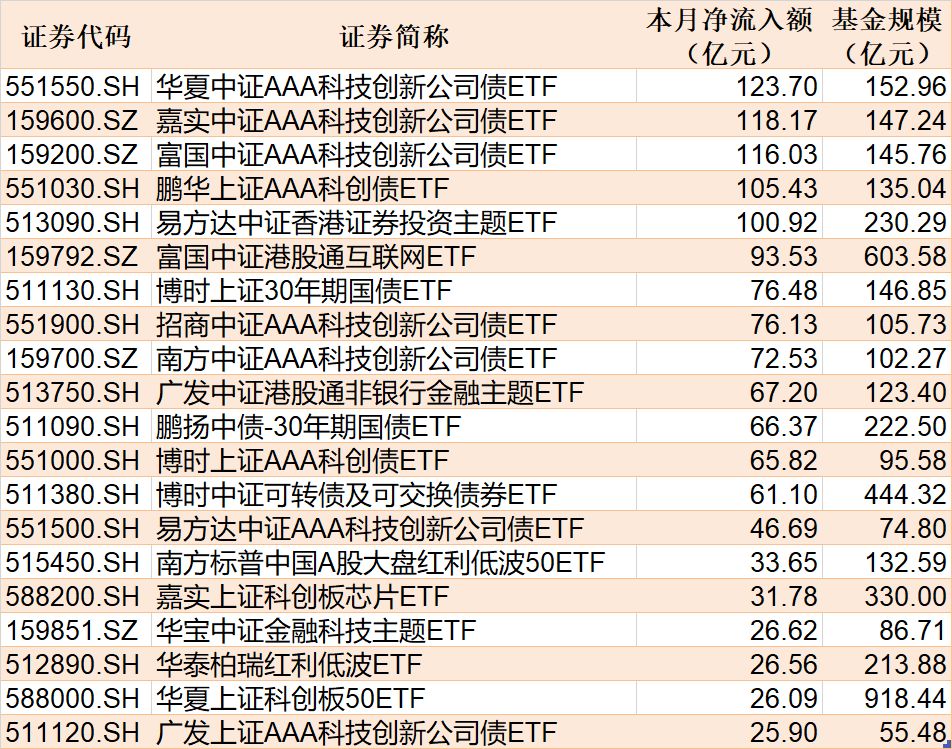 与此同时,华泰柏瑞沪深 300ETF 基金份额减少 3.88 亿份,净流出额为 16.34 亿元;海富通中证短融 ETF 份额减少 0.13 亿份,净流出额为 14.44 亿元;华夏上证科创板 50ETF 份额减少 10.26 亿份,净流出额为 11.48 亿元。