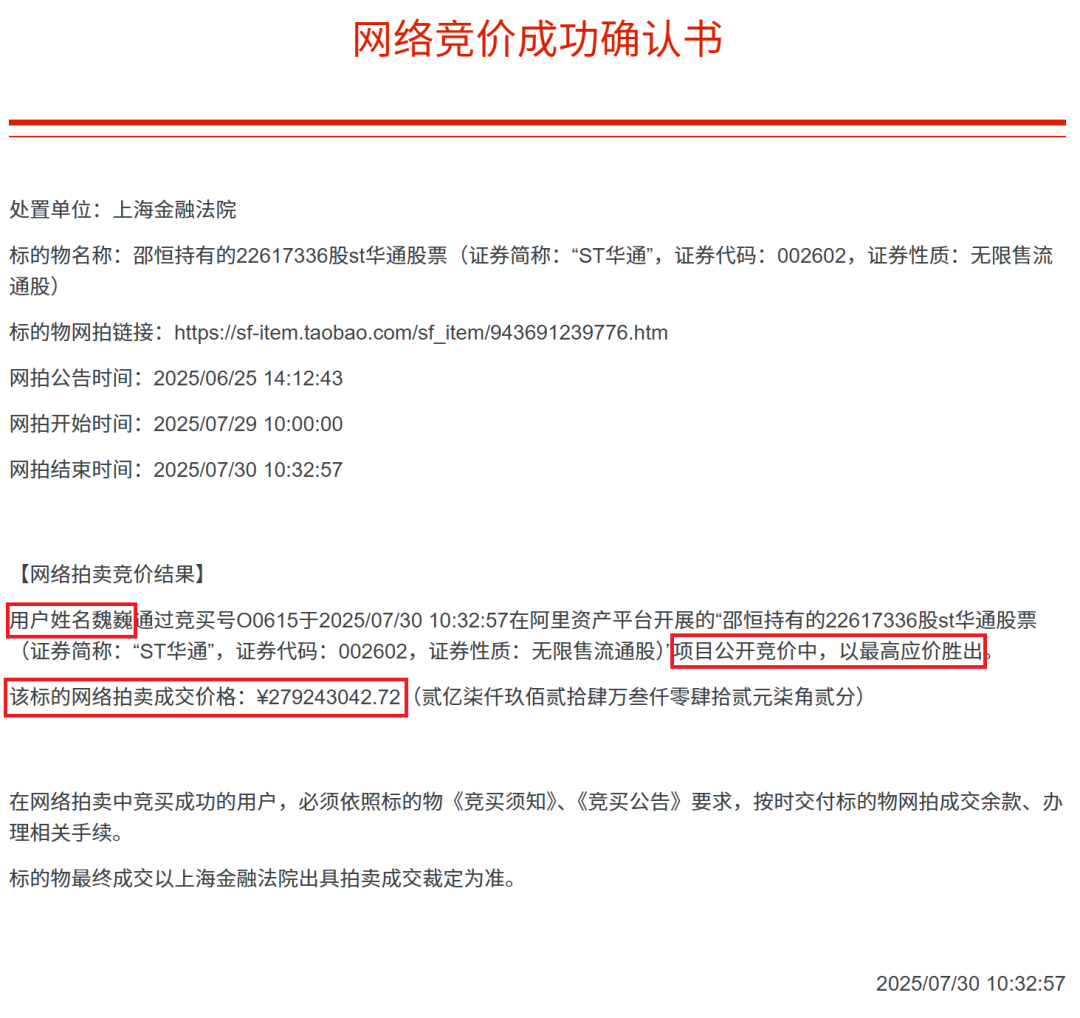 上海金融法院 7 月 30 日上午出具的 《网络竞价成功确认书》 显示,邵恒持有的 2261.73 万股 ST 华通无限售流通股的网络拍卖竞价结果为:用户姓名魏巍通过竞买号 O0615,在项目公开竞价中以最高应价胜出,网络拍卖成交价格为 2.79 亿元,较 2.49 亿元的起拍价溢价约 12%,折合每股价格约为 12.35 元。