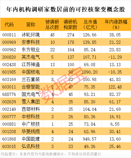 相关概念股也受到投资者关注。据证券时报·数据宝统计,今年以来,近 50 余只可控核聚变概念股中,几乎所有个股都接受了投资者调研。从调研次数看,冰轮环境、东方钽业、江苏神通、安泰科技获得 10 次及以上调研;从调研机构家数看,冰轮环境、安泰科技、东方钽业、英杰电气、江苏神通获得百家及以上机构调研。