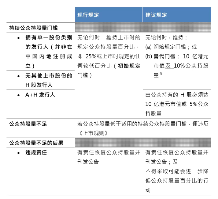 同时,新层级式架构的最低初始公众持股量门槛由原建议的 5% 上调至 10%,而适用于 A+H 发行人的初始自由流通量门槛由原建议中 「占 H 股总数的 10%」 改为 「占 A+H 股总数的 5%」。