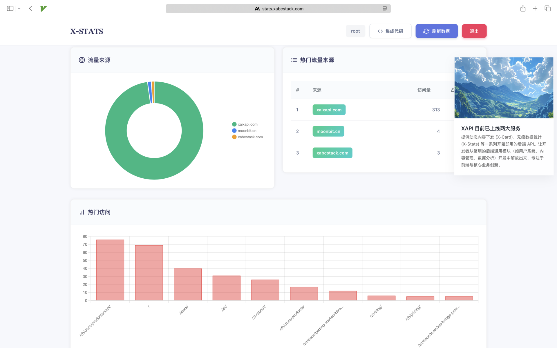 X-STATS 是一个简单、无 Cookie 的访问统计服务,用于轻量级地追踪页面或链接的访问数据,对访客隐私友好,当前页面下方的数据统计即由 X-STATS 提供支持。