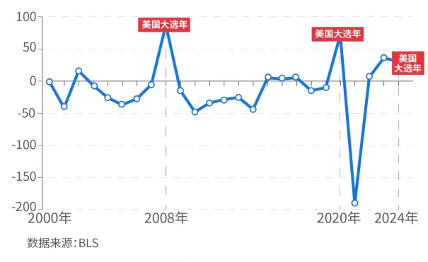 2000 年至 2024 年间,美国非农数据高估极值多发生在大选年 (数据来源:BLS)