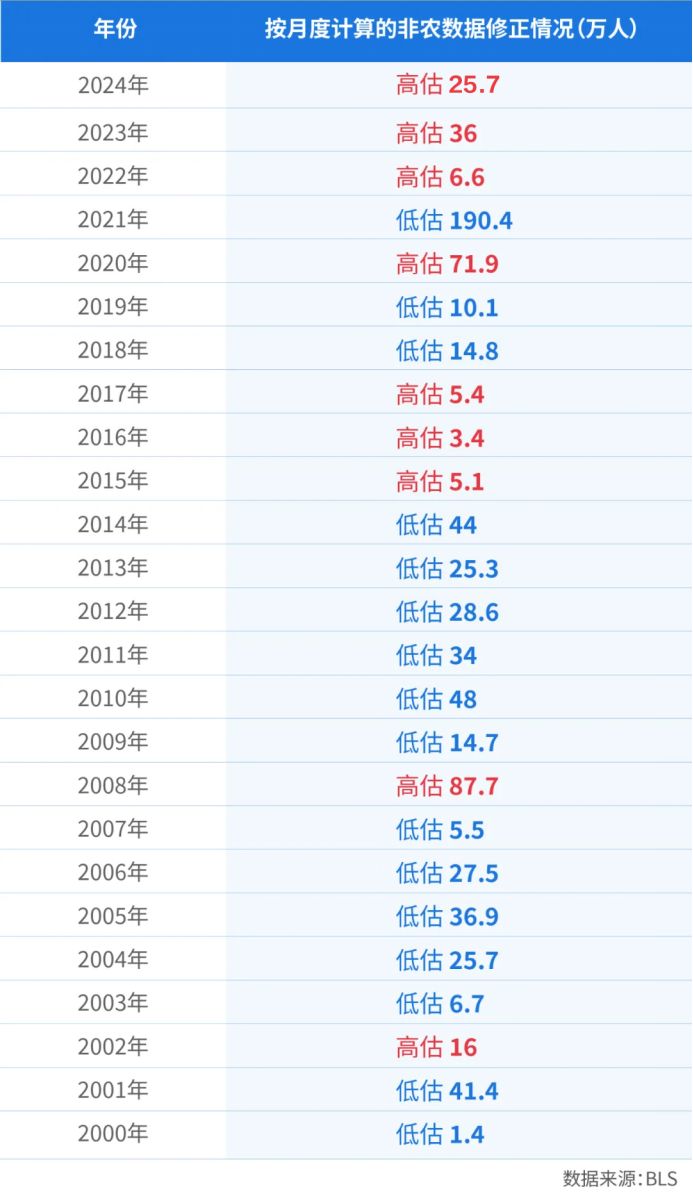 2000 年至 2024 年美国非农数据修正情况 (数据来源:BLS)