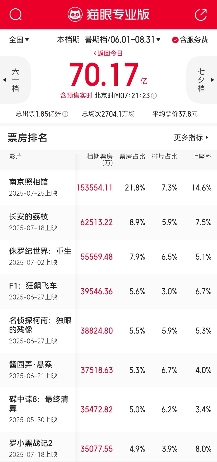 从单部影片票房来看,据猫眼专业版数据 (截至 8 月 4 日 7 时 21 分),《南京照相馆》 位列 2025 年暑期档榜首,总票房破 15 亿元;《长安的荔枝》 累计票房超 6 亿元,位列第二;《侏罗纪世界:重生》 累计票房超 5.5 亿元,位列第三。