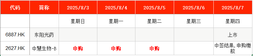 Wind 数据显示,本周 (8 月 4 日至 8 月 8 日) 港股的中慧生物-B(02627.HK) 在周一和周二申购;东阳光药 (06887.HK) 在周五上市。