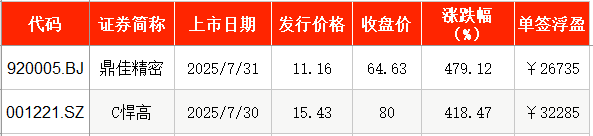 7 月 31 日,鼎佳精密在北交所正式挂牌上市,发行价为 11.16 元/股,截至上市首日收盘,该股报 64.63 元/股,涨幅为 479.12%。以收盘价计算,投资者中一签浮盈为 2.67 万元。