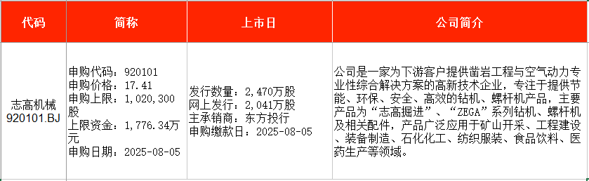 从时间表看,志高机械 (920101) 将在本周二 (8 月 5 日) 申购。