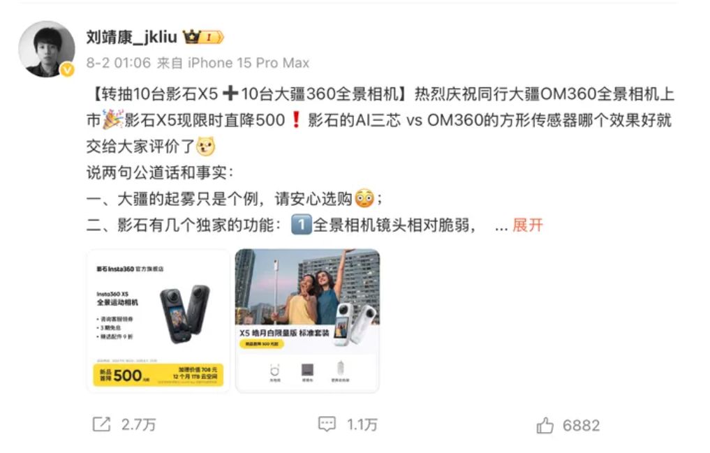 此后刘靖康发布朋友圈,提到尊重大疆。「领跑马拉松的是顶级选手,你也会跑得更快。」 刘靖康表示,公司做无人机的起因包括看到客户需求未被满足,有市场增量空间,且会驱动公司成长。刘靖康提到,进入无人机市场是五年前的决策,他还表示,影石预想过做这个决策会刺激大疆做全景相机 「抄家」。