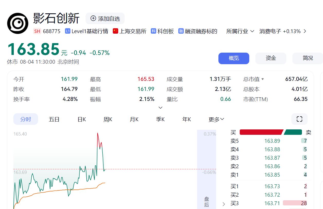 8 月 4 日,截至上午收盘,影石创新股价下跌 0.57%,报 163.85 元/股,总市值为 657.04 亿元。